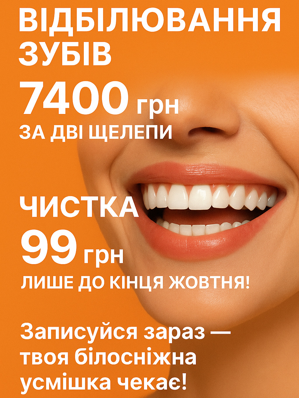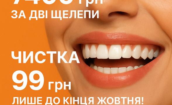 Зараз — найкращий момент! Лише до кінця жовтня ти можеш отримати професійне відбілювання всього за 7400 грн за дві щелепи А ще — чистку лише за 99 грн