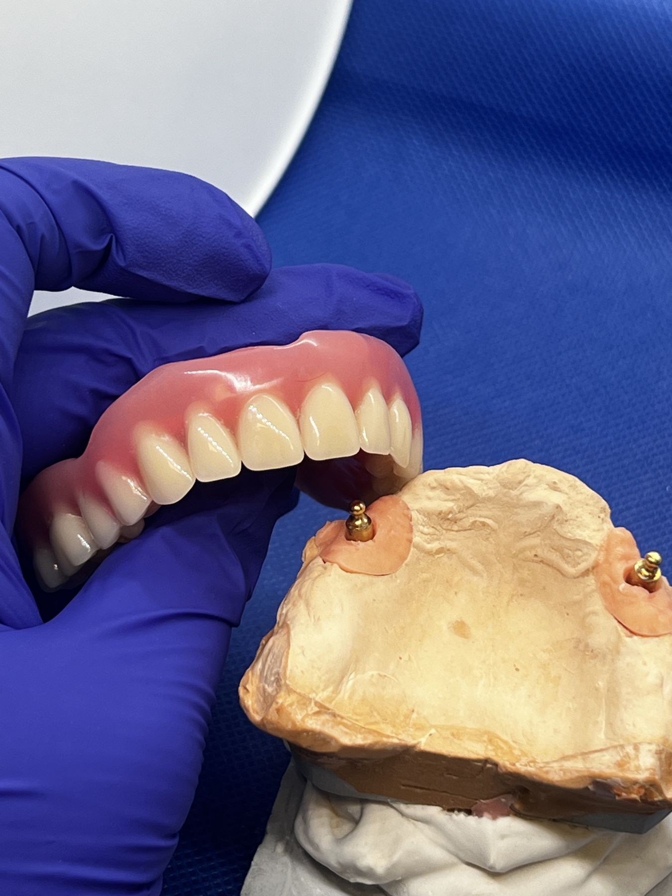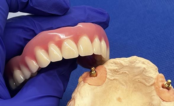 Якщо всі зуби втрачені, але хочеться кращої фіксації, ніж у звичайного знімного протеза — можна встановити 2 імпланти та закріпити на них повний акриловий протез.