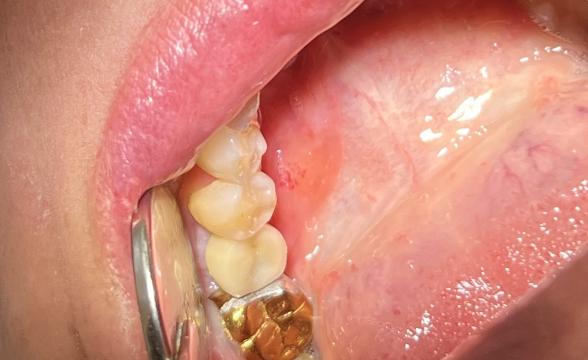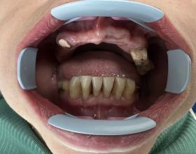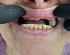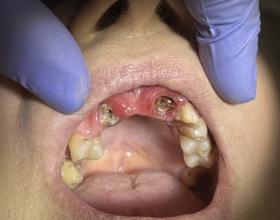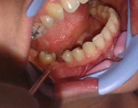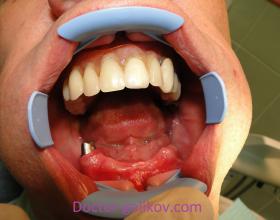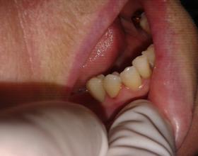 Протезирование нижней челюсти металлокерамической коронкой на вкладке и нейлоновым сьемным протезом.