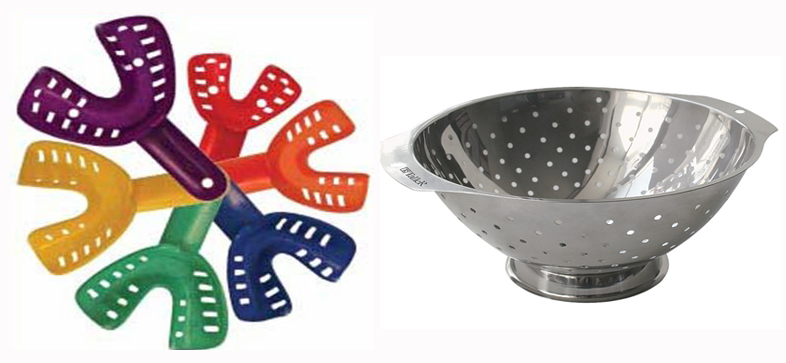 Сегодня сотрудница (не врач) в частной клинике смотрит хитрыми-хитрыми глазками на перфорированные (с дырочками для дополнительной фиксации) оттискные ложки и спрашивает: а что это у вас, зубников, за дуршляжки такие? У медсестры чуть "Чашка Петри" от смеха и удивления из рук не выпала.